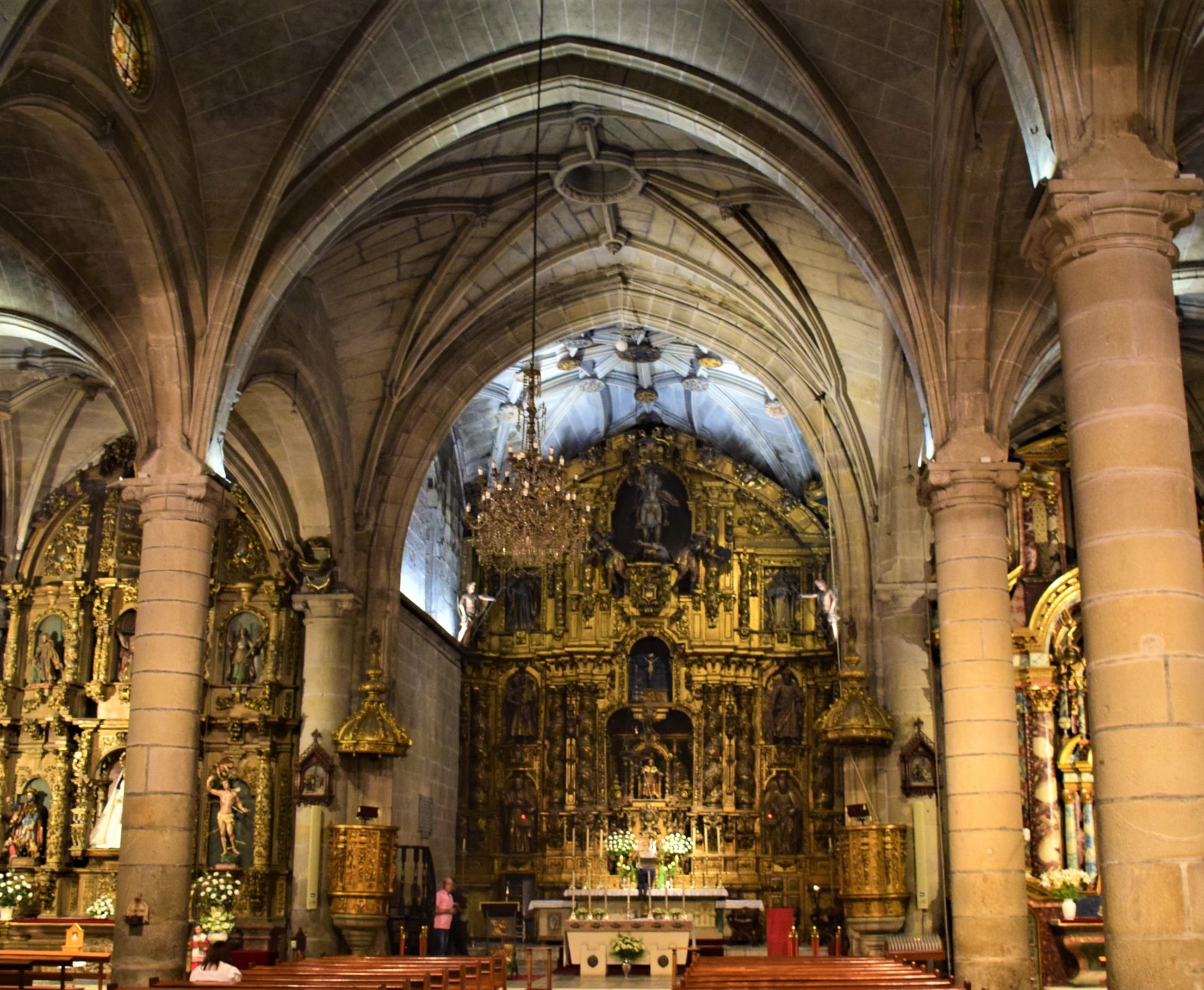 Subiendo por la calle hallamos la estatua ecuestre de Santiago Apóstol, una de las imágenes más conocidas de nuestro conjunto histórico. Así alcanzamos la principal joya arquitectónica que atesora la villa, y máximo orgullo de los cangueses: la Ex-colegiata de Santiago. Su portada renacentista, levantada en 1585, se cuenta entre las más bellas de toda Galicia. Pero es preciso, además, visitar su interior, sus majestuosas naves, retablos barrocos e imágenes de altísimo valor artístico, ante los que nadie queda indiferente. Aunque posiblemente nada levante tanta admiración como el otro Cristo, el del Consuelo, viva expresión del sufrimiento en la Cruz que tan bien supo plasmar el maestro Juan Pintos, destaca el Cristo “milagroso”, del que se cuenta que “no quiso arder”; pues en el año 1617 sobrevivió al incendio del templo por parte de los piratas turcos.
